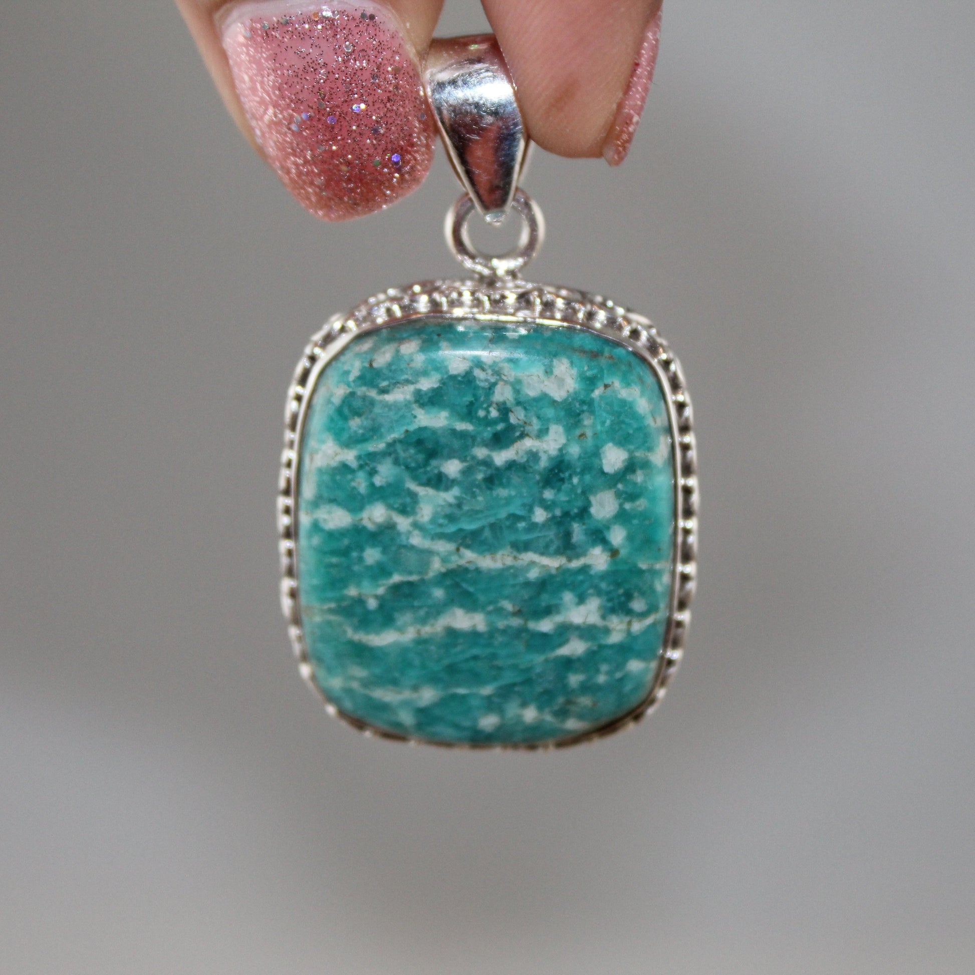 Set in an ornate sterling silver frame, this pendant blends bohemian artistry with timeless sophistication. Amazonite, often called the stone of truth and harmony, is believed to promote peace, communication, and emotional healing — making it the perfect everyday talisman for free-spirited souls.