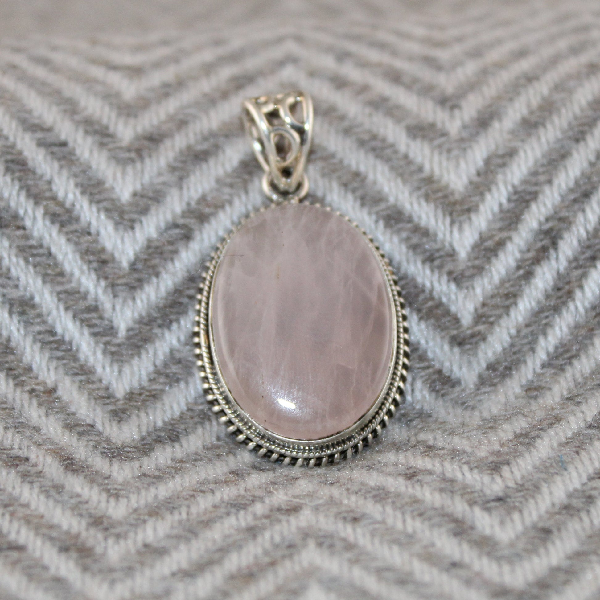 Softly luminous and feminine, our Blushing Dawn pendant captures the tender charm of natural rose quartz — the stone of love and compassion. Its delicate blush hue glows through a polished oval cabochon, set in intricately detailed sterling silver that adds a timeless, handcrafted allure.